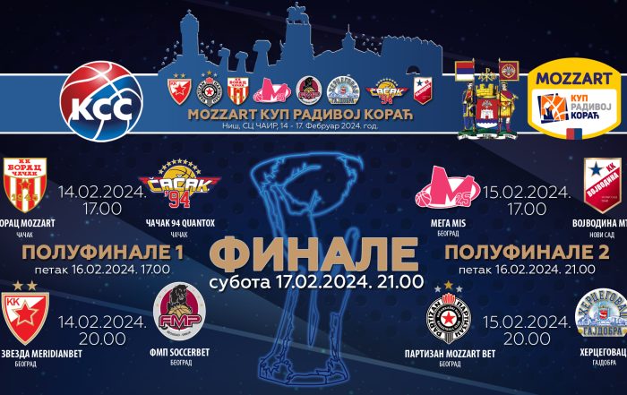 У четвртфиналу Моцарт Купа Радивој Кораћ (14-17. фебруар) у Нишу играће: Борац Моцарт – Чачак 94 Quantox (14.02. у 17.00), Црвена звезда Меридианбет – ФМП Сокербет (14.02. у 20.00), Мега МИС – Војводина МТС (15.02. [...]
