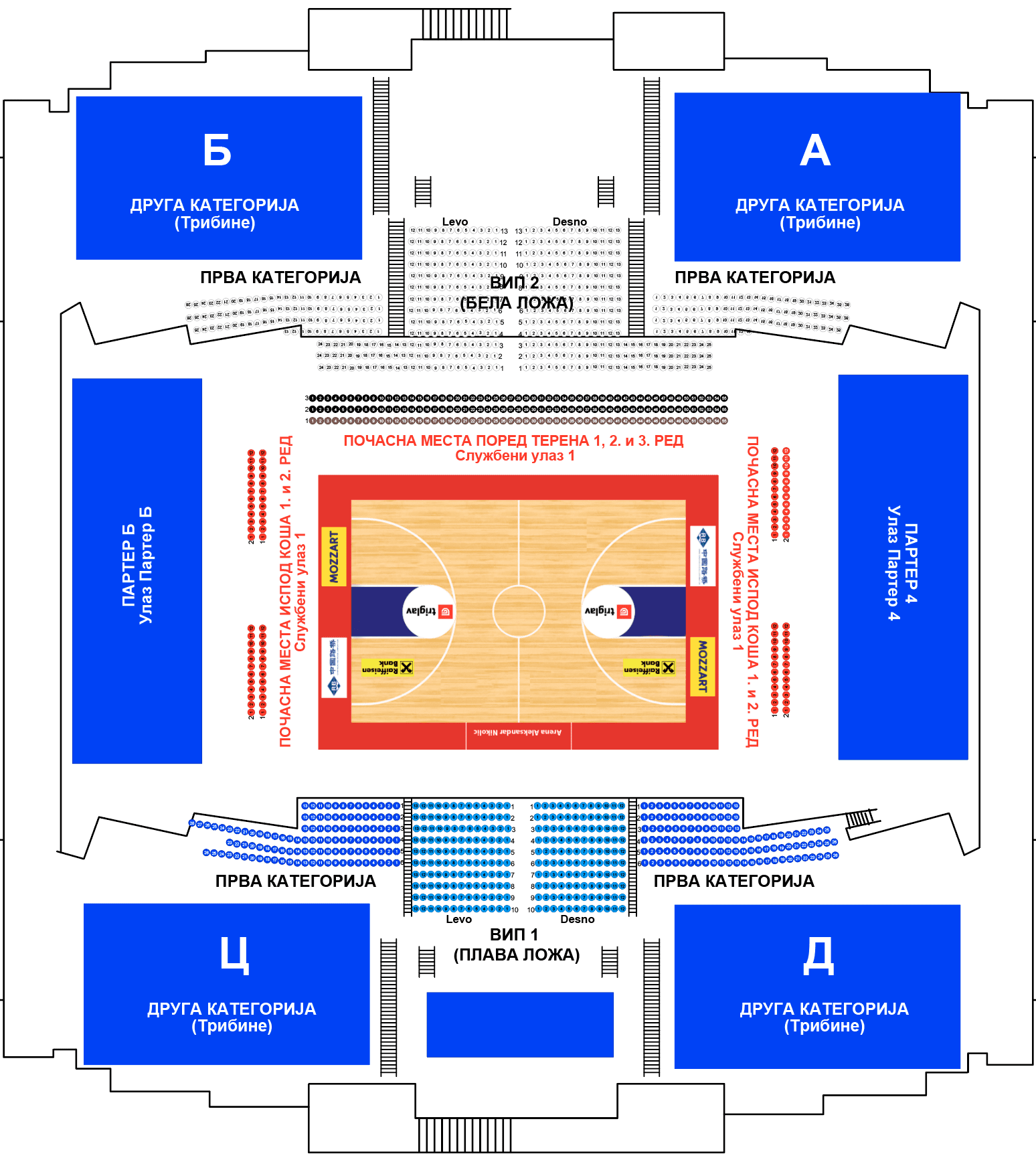 ПРВА КАТЕГОРИЈА (Mеста са стране поред ВИП 1 и ВИП 2 дела трибине) – Улази А, Б, Ц и Д.
