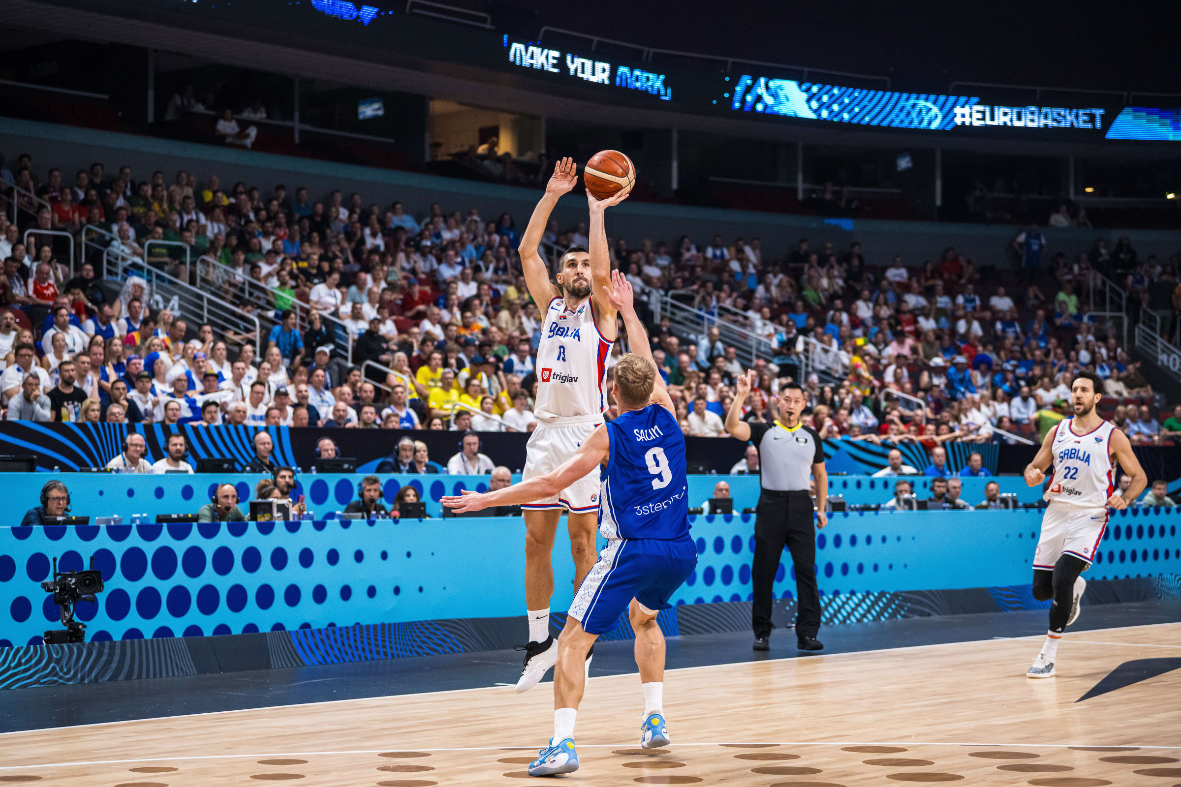 Да има одлично шутерко вече, Никола Јовић показао је још једном чим је почела трећа четвртина погодивши тројку што је био његов 15. поен. Таман када је Србија поново стигла до шест поена предности, противник је експресно одговорио у виду серије од 7:0 и преузео вођство (53:52). Уследило је неколико промашених шутева и лоших одлука у нападу нашег тима, а Финци су поново почели да погађају са дистанце – две тројке Салина и једна Валтонена. Србија се у нападу ослањала углавном на Јокића кога су противнички играчи слали на линију за слободна бацања, а придружио му се у финишу трећег периода Добрић полагањем и тројком.
