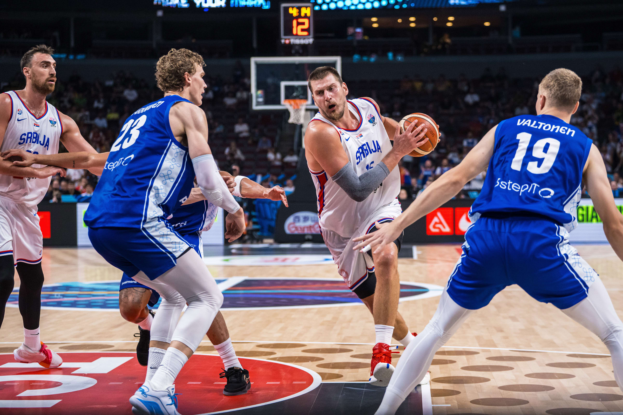 Погодио је Гудурић тројку за 74:75, па Јокић „2+1“ за вођство Србије 77:75 у 36. минуту. Изједначили су Финци, па опет повели преко Марканена 79:77. Погодио је Јокић једно бацање, па Финци промашили, па Никола Јовић промашио тројку. Погодио је Валтонен минут касније за три за 84:81, онда још једну за 87:81 на 53.7 секунди пре краја. Промашио је тројку Гудурић, Стефан Јовић фаулирао Марканена, који је био два пута сигуран – 89:81. Погодио је Никола Јовић за два (83:89), па је фаулирани Марканен убацио оба пенала (91:83). Погодио је Јокић тројку (86:91), фаулиран је поново Марканен и погодио једном са пенала (92:86) и ту је био крај.